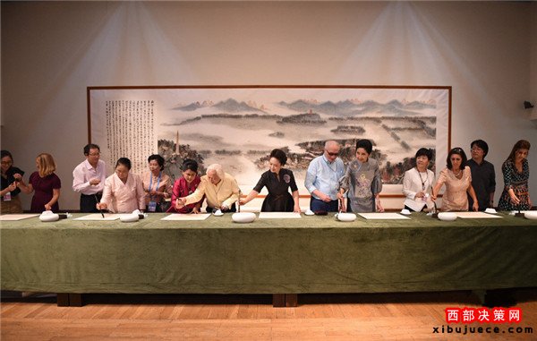 在觀看“意象中國”書畫展時,彭麗媛和來賓們在《西溪紀(jì)勝圖》、《朱荷圖軸》等經(jīng)典國畫作品前駐足觀看,接著欣賞4位著名書畫家現(xiàn)場聯(lián)袂創(chuàng)作書畫作品《江南憶》。一位書法家還為來賓們現(xiàn)場示范毛筆的執(zhí)筆、運(yùn)筆方式。彭麗媛邀請來賓們一同書寫漢字“和”。她說,“和”字在漢語里具有“和平”、“和諧”之義,是我們對世界的共同心愿。來賓們饒有興致地拿起毛筆各自書寫,并展示自己的書法作品。彭麗媛說,昨晚各位在西湖邊觀看了精彩的文藝演出,今天我們在這里一同欣賞畫中的西湖。她同來賓們在國畫《西湖秋勝》前合影留念。