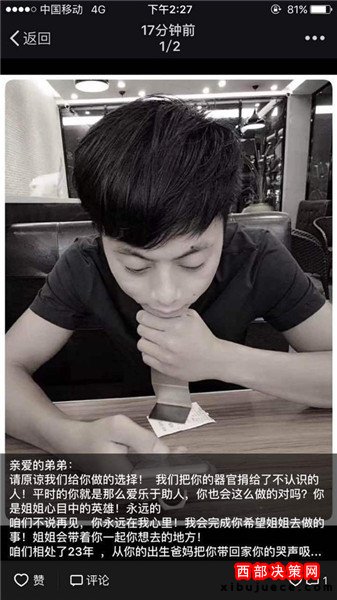 據(jù)了解,22歲的吳遠(yuǎn)旋在東莞鳳崗工作。9月3日凌晨五點(diǎn),他騎摩托車送友人上班時,不幸發(fā)生車禍,導(dǎo)致重度顱腦外傷,達(dá)到腦死亡狀態(tài)。家屬召開家庭會議后,決定把吳遠(yuǎn)旋所有的重要器官捐獻(xiàn)出來,救助他人。