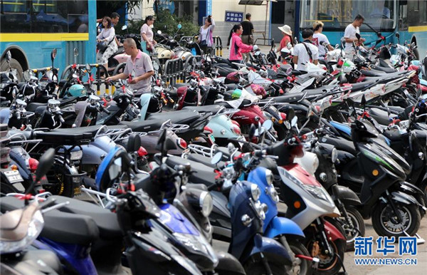 10月11日,市民在廣西南寧市街頭一個(gè)停車場(chǎng)存取電動(dòng)自行車。