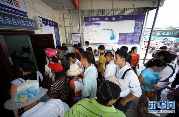 10月11日,市民在廣西南寧市獅山電動(dòng)自行車工作站排隊(duì)給自己的電動(dòng)自行車上牌。