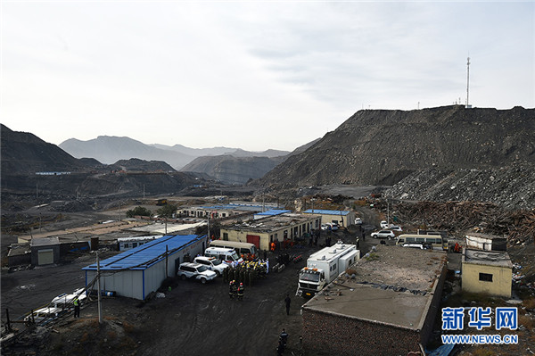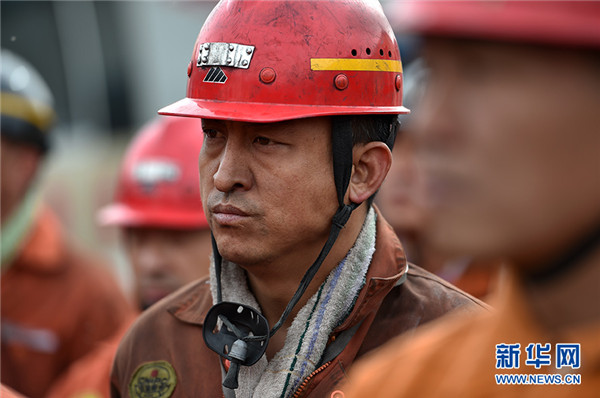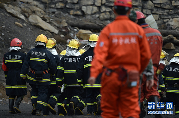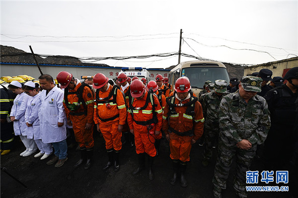 10月11日,在寧夏石嘴山市林利煤礦,現(xiàn)場搜救工作暫停后救援人員進行集體默哀。