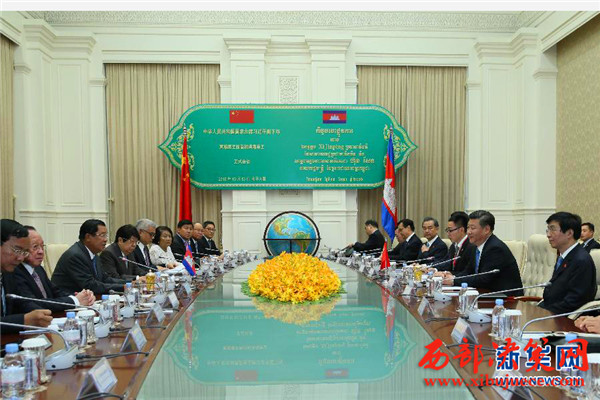會(huì)談后,兩國領(lǐng)導(dǎo)人共同見證了外交、共建“一帶一路”、產(chǎn)能合作、投資、水利、新聞、海洋等領(lǐng)域多項(xiàng)雙邊合作文件的簽署,并共同出席金邊中國文化中心揭牌儀式。