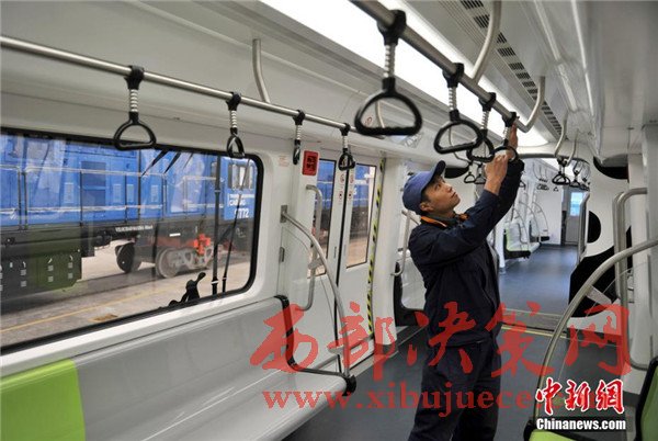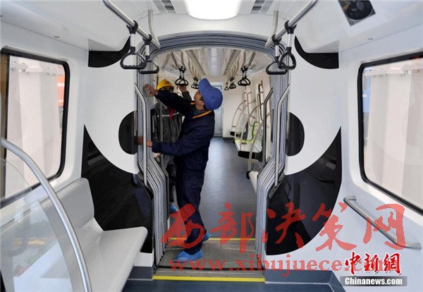 此外,列車整體結(jié)構(gòu)也采用輕量化設(shè)計(jì),全線無人駕駛,能像地鐵、動(dòng)車組一樣靈活編組。列車在懸掛裝置設(shè)有兩級(jí)保護(hù),還在駕駛室內(nèi)設(shè)有緊急逃生筒和故障救援門,可實(shí)現(xiàn)縱向、橫向及垂向的三維救援,確保了突發(fā)情況下乘客的安全。圖為車廂內(nèi)也繪有“熊貓”圖案。