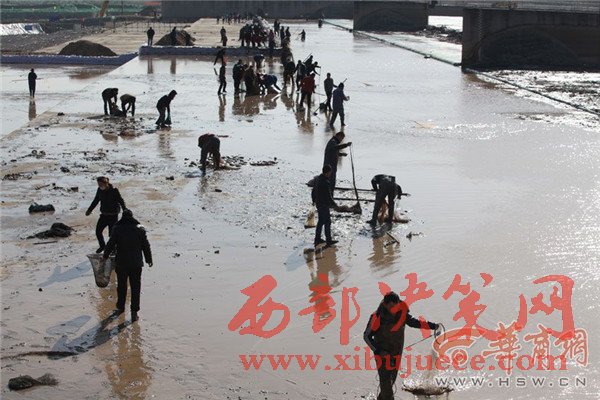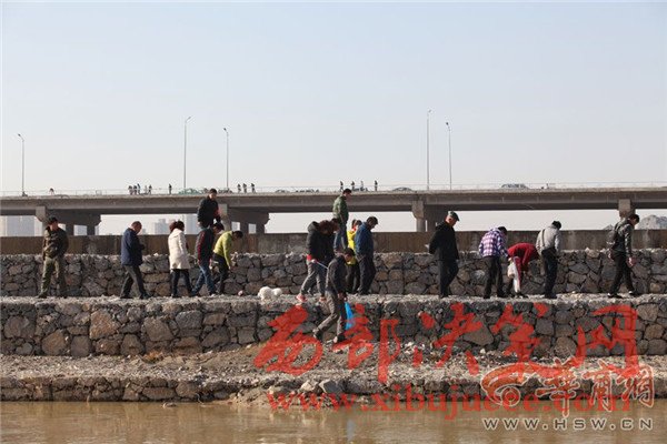 12月27日上午,咸陽湖放水剛結束,渭城橋下瞬間就變成了漁場,數百人在橡膠壩附近撿魚捕魚,有人甚至不顧危險跑到淤泥里去撈魚。咸陽湖管理處工作人員提醒,湖底淤泥情況不明,市民切勿涉險下湖撈魚,以免發(fā)生不測。