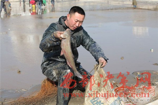 橋上釣魚人忙得不亦樂乎,橋下撈魚者也是爭先恐后。咸陽湖橡膠壩附近,不少市民拎著袋子和塑料桶在石縫里尋找殘留的小魚。比起這些撿小魚的市民,橡膠壩下面水洼處的幾名捕魚人則要更專業(yè)一些,他們下到水里,用力將網甩出去,一網子下去最少也有10多條大魚。有些人沒有撈到魚,便現場從捕魚人手里花上10元或20元,買上一條大魚心滿意足地回家去了。