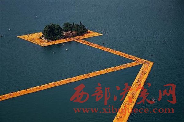 當(dāng)代概念藝術(shù)家Christo因開拓土地藝術(shù)而聞名。在他最新的項目漂浮碼頭中,Christo搭建了很多亮黃色的小路,邀請意大利Sulzano的居民和游客步行通勤至別的導(dǎo)語。和Christo的其他裝置一樣,漂浮碼頭作品中的其他地方景觀也扮演著重要的角色。“湖周圍的山脈提供了鳥瞰該作品的地點,展現(xiàn)了那些之前沒被注意的角度”,他解釋道。“水、風(fēng)、太陽,都是這個項目的一部分。”
