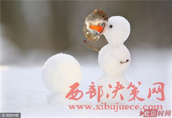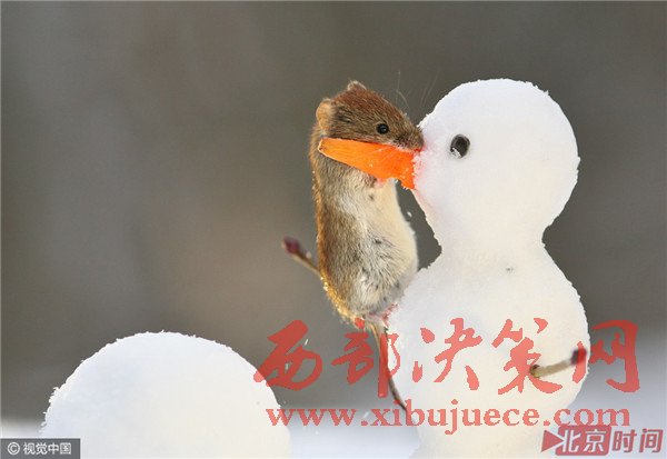 田鼠爬到小雪人身上,吃掉雪人“鼻子”萌翻了