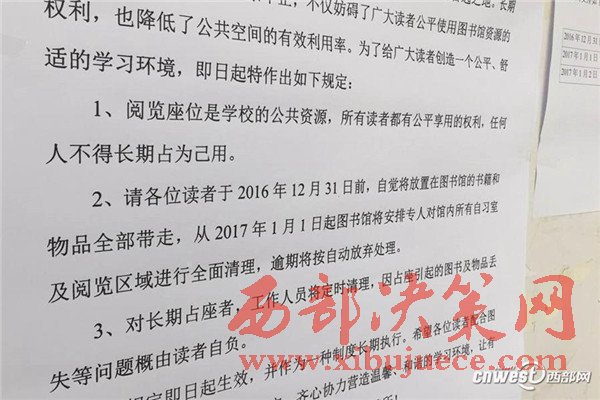 記者看到就在圖書館的入口貼著圖書館關(guān)于清理閱覽室座位的通知,上門寫著因為館內(nèi)占座問題屢禁不止,請同學(xué)們在12月31號前將自己的物品帶走,從1月1號起將全面清理閱覽室,通知貼出的時間是12月28號。