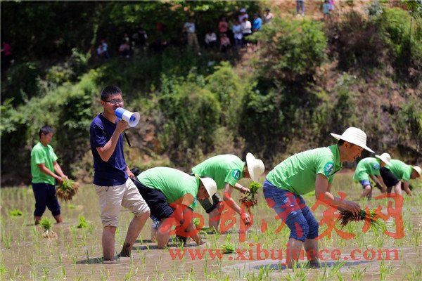 游客在寧陜海棠園村體驗插秧