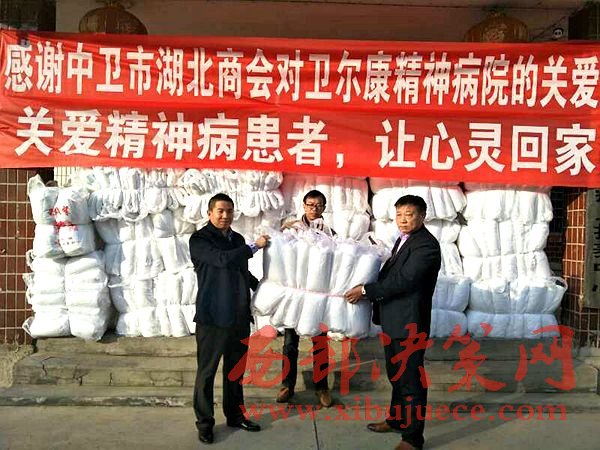 西部決策網(wǎng)訊(黃貞 楊新)2017年1月9日,中衛(wèi)市湖北商會(huì)一行數(shù)人在會(huì)長(zhǎng)朱秀東的帶領(lǐng)下,前往中衛(wèi)市衛(wèi)爾康精神病醫(yī)院進(jìn)行新年前慰問,并送去價(jià)值2萬余元的過冬棉被。