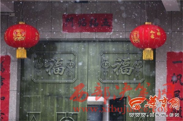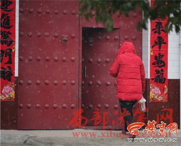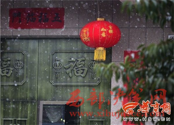 在高陵區(qū)一家農(nóng)戶門(mén)口,瑞雪與燈籠、對(duì)聯(lián)相應(yīng),也有了過(guò)年的氣氛。