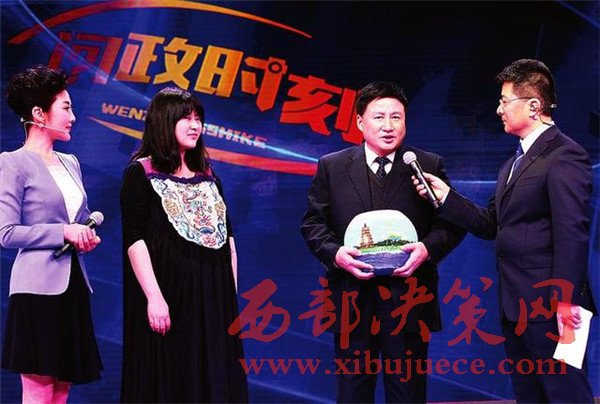 問政現(xiàn)場一位準(zhǔn)媽媽向西安市環(huán)保局局長陳松林贈(zèng)送了一個(gè)青山綠水沙畫瓶