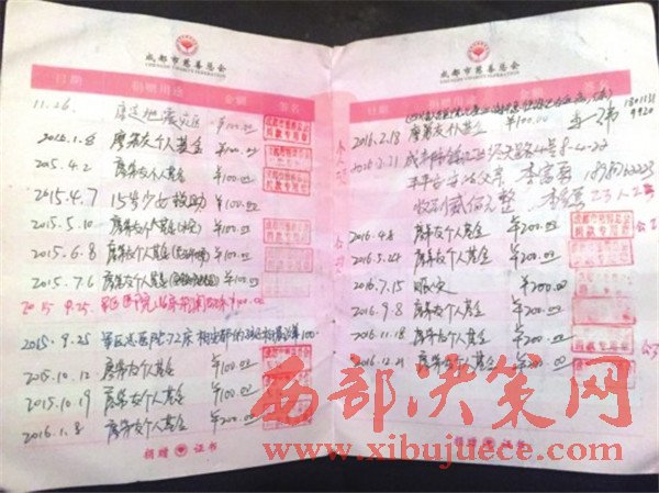 從賑災捐款,到為愛助醫(yī),從公眾熟知的“提燈女孩”王思培,到無人注意的早產雙胞胎,成都慈善總會為廖弟友發(fā)放的捐款證書上,每一頁都記著受助者的名字和個人基金的用途。翻看捐款證書,僅從2011年3月到2016年12月這段時間內,廖弟友的捐款次數達到58次,最近一次是2016年12月存入個人慈善基金的記錄。