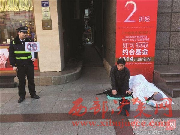 元宵節(jié)當(dāng)天,張家港沙洲路步行街一商場(chǎng)樓下,一名年輕男子以母親患重病為由跪地乞討,"母親"就躺在地上,旁邊站著一名城管協(xié)管員,舉起了寫(xiě)著"詐騙請(qǐng)小心"的牌子。被攪了局的"行乞者"最后只能逃之夭夭。據(jù)當(dāng)事城管協(xié)管員介紹,乞討男子是個(gè)"熟面孔",當(dāng)天曾躲進(jìn)小弄堂里抽煙打電話,用的是蘋(píng)果手機(jī),抽的是中華煙,這讓他們更加確信,男子是職業(yè)行乞,根本不是家中有困難。揚(yáng)子晚報(bào)全媒體記者於蘇云