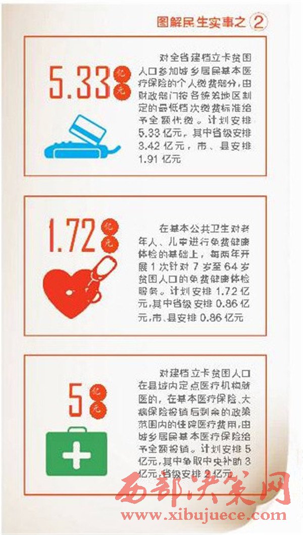 對建檔立卡貧困人口在縣域內(nèi)定點(diǎn)醫(yī)療機(jī)構(gòu)就醫(yī)的,在基本醫(yī)療保險、大病保險報銷后剩余的政策范圍內(nèi)的住院醫(yī)療費(fèi)用,由城鄉(xiāng)居民基本醫(yī)療保險給予全額報銷。計劃安排5億元,其中爭取中央補(bǔ)助3億元,省級安排2億元