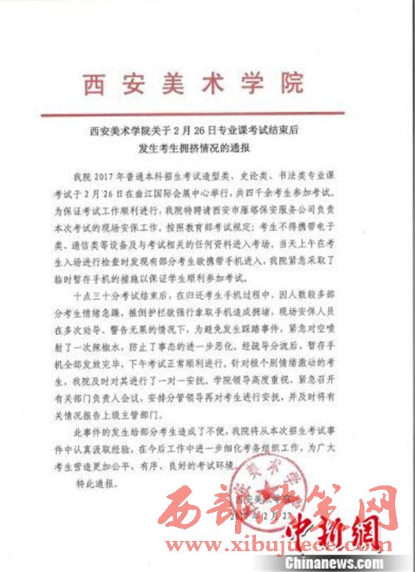 西安美術學院發(fā)布的事件通報稱,考試結束后,在歸還手機過程中,因人數較多部分考生情緒急躁,推倒護欄欲強行拿取手機造成擁堵,現場安保人員在多次勸導、警告無果的情況下,為避免發(fā)生踩踏時間,緊急對空噴射了一次辣椒水,防止了事態(tài)的進一步惡化。經疏導分流后,暫存手機全部發(fā)放完畢,下午考試順利進行。針對個別情緒激動的考生,該院即使對其進行了一對一安撫。學院領導高度重視,緊急召開有關部門負責人會議,安排分管領導再對考生進行安撫,并及時將有關情況報告上級主管部門。此事件的發(fā)生給部分考生造成了不便,該院將從本次招生考試事件中認真汲取經驗,在今后工作中進一步細化考務組織工作,為廣大考生營造更加公平、有序、良好的考試環(huán)境。