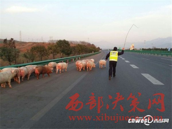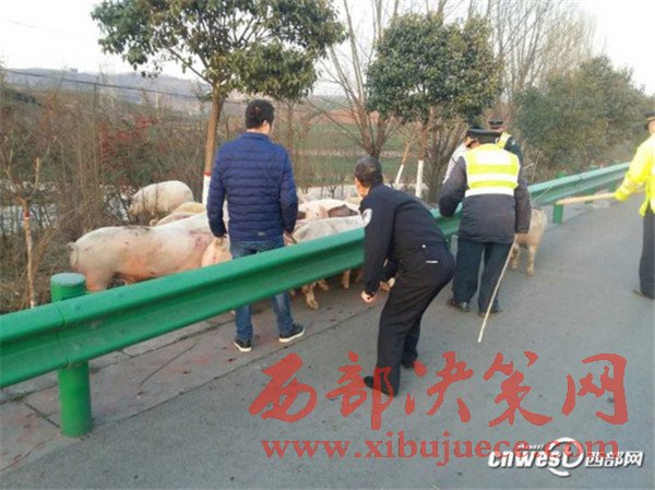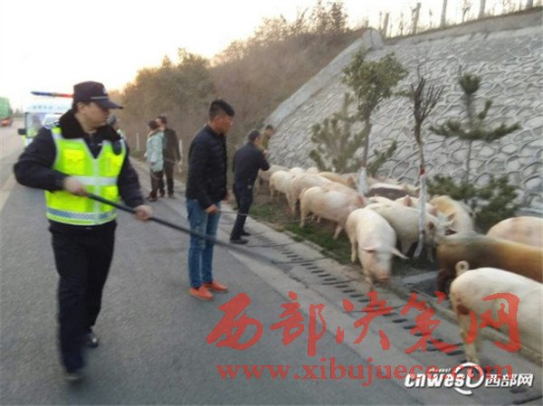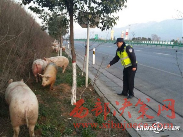 貨車(chē)側(cè)翻生豬高速上撒歡,西安交警揮鞭子趕豬回圈。