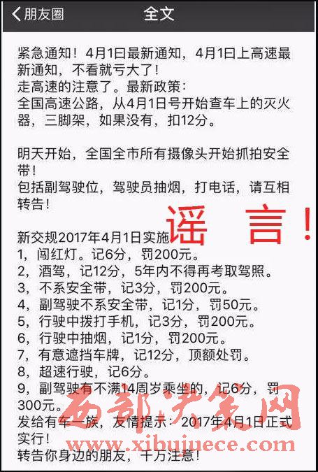 1.【謠言】“4月1日起高速上查車(chē),沒(méi)有滅火器扣12分;同時(shí)新交規(guī)開(kāi)始實(shí)施……”近日,這則關(guān)于“4月1日起新交通法規(guī)將實(shí)行”的消息出現(xiàn)在多地網(wǎng)民的微信朋友圈中。在網(wǎng)傳的消息中,“不系安全帶記3分、罰200元,副駕駛不系安全帶記1分、罰50元,行駛中撥打手機(jī)記3分、罰200元,行駛中抽煙記1分、罰200元……”種種條款讓網(wǎng)民頗為緊張。