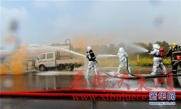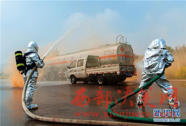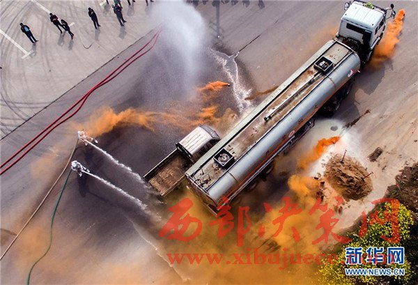 4月6日,參加演練人員對危化品運輸車輛“交通事故”現(xiàn)場進行處置。