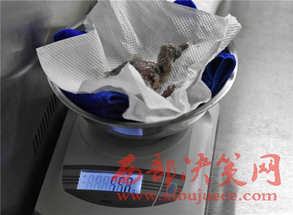 4月19日,工作人員在給朱鹮雛鳥稱體重。