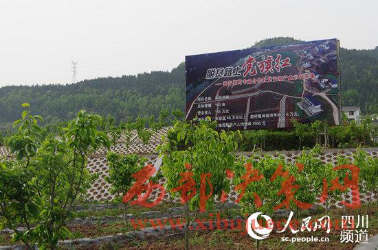 四川省巴中市巴州區(qū)曾口鎮(zhèn)秧田溝村黨支部產(chǎn)業(yè)示范基地內樹立起“脫貧路上黨旗紅”的牌子。