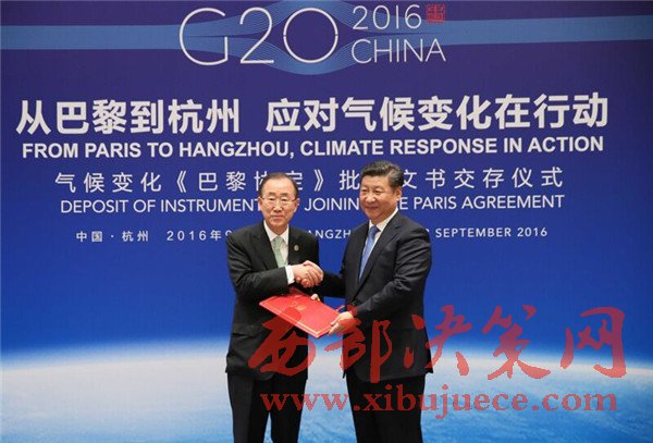 2016年9月3日,國(guó)家主席習(xí)近平同美國(guó)總統(tǒng)奧巴馬、聯(lián)合國(guó)秘書長(zhǎng)潘基文在杭州共同出席氣候變化《巴黎協(xié)定》批準(zhǔn)文書交存儀式。這是習(xí)近平向潘基文交存中國(guó)氣候變化《巴黎協(xié)定》批準(zhǔn)文書。(記者 蘭紅光 攝)