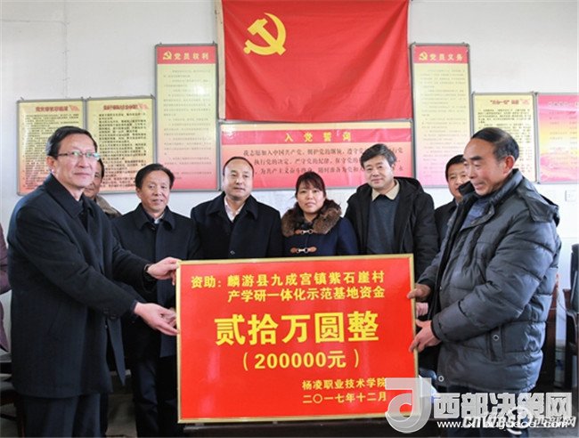 12月15日,為為貫徹落實(shí) 《全省脫貧攻堅(jiān) 2017冬季行動(dòng)方案》精神,扎實(shí)推進(jìn)高校結(jié)對(duì)幫扶“雙百工程”,有效地為當(dāng)?shù)靥厣a(chǎn)業(yè)服務(wù),楊凌職業(yè)技術(shù)學(xué)院黨委書記趙曼、黨委副書記任得元一行來(lái)到麟游縣九成宮鎮(zhèn)紫石崖村,為該村捐贈(zèng)20萬(wàn)元,用于建立中蜂養(yǎng)殖產(chǎn)學(xué)研一體化示范基地、核桃豐產(chǎn)栽培產(chǎn)學(xué)研一體化示范基地及電商網(wǎng)絡(luò)平臺(tái)。