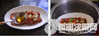 5、蒸鍋?zhàn)⑺疅_(kāi),放入臘肉,蒸制20分鐘至臘肉酥軟。