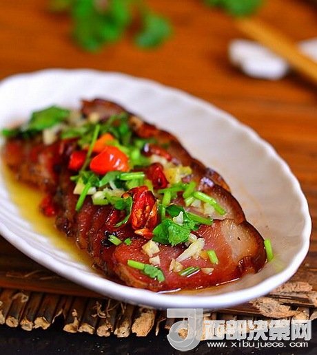 原料:臘肉、朝天椒、花椒、蒜末、香菜。
