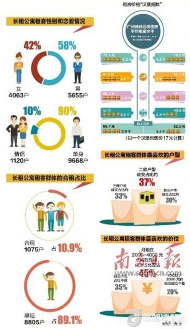 那么,對廣州這座全國主要的一線城市來說,目前的住房租賃市場和租房的情況與其他城市有何不同呢?最近,南方日報、南方+聯(lián)合萬科泊寓、廣州中原地產(chǎn)等企業(yè)機構(gòu),在“租房時代”南方號向廣大網(wǎng)友和住房租賃行業(yè)人士推出了“廣州地鐵沿線住房平均租金漢堡指數(shù)”、“長租公寓租房群體畫像”等系列大數(shù)據(jù)分析產(chǎn)品。