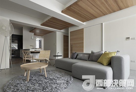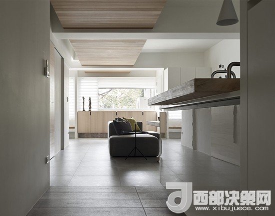 站在長廊一頭視線忍不住會(huì)跟著木質(zhì)頂板向前眺望,一直延伸至窗外,室外的采光經(jīng)過漫反射幾乎可以引入整個(gè)客廳。