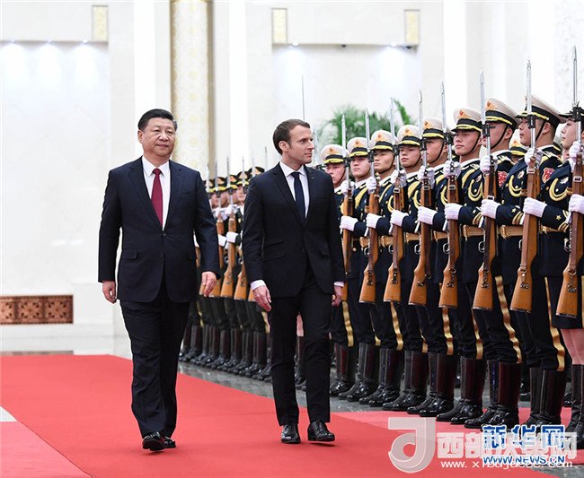 會談前,習近平在人民大會堂北大廳為馬克龍舉行歡迎儀式。習近平主席夫人彭麗媛,中共中央政治局委員、國務委員楊潔篪,全國人大常委會副委員長陳竺,全國政協(xié)副主席林文漪等參加。(記者白潔 許可 王卓倫)