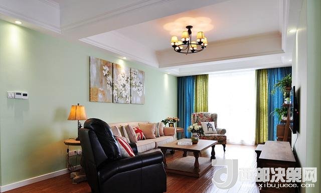 沙發(fā)墻上的油畫和茶桌刪搞得插花,遙相呼應(yīng),給人清新自然之感。