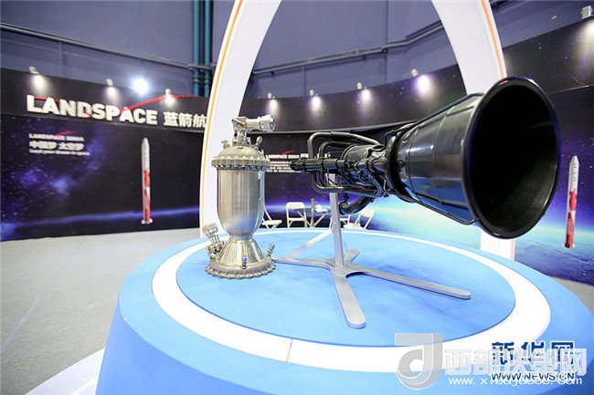 現(xiàn)場展示的藍(lán)箭航天商業(yè)運(yùn)載火箭發(fā)動機(jī)等比例模型。新華網(wǎng)才萌攝