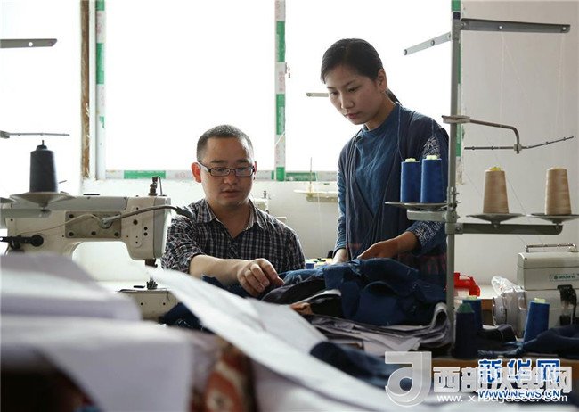 5月2日,在貴州省丹寨縣,張義蘋(右)與同事討論蠟染服裝樣式。