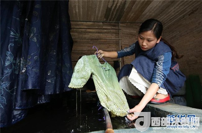 5月2日,在貴州省丹寨縣,張義蘋在染房內查看蠟染產品的染色效果。
