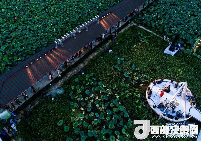 樂(lè)隊(duì)組合在浙江省建德市大慈巖鎮(zhèn)里葉村荷田間的舞臺(tái)上進(jìn)行演奏(7月14日無(wú)人機(jī)拍攝)。新華社記者 徐昱 攝