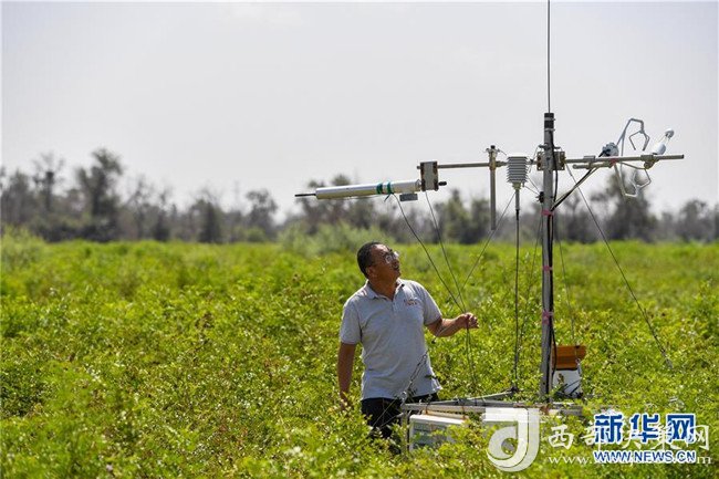 在內蒙古鄂爾多斯市的庫布其沙漠中的億利集團阿木古龍甘草健康產業(yè)園,工作人員在儀器前觀測氣候土壤條件(7月11日攝)。 新華社記者 彭源 攝