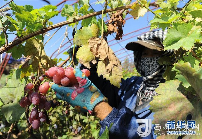 8月22日,在中衛(wèi)市沙坡頭區(qū)一家生態(tài)養(yǎng)殖基地,工作人員在采摘葡萄。該養(yǎng)殖基地經(jīng)改造沙漠建成,占地500余畝,目前已發(fā)展葡萄種植、肉牛、奶牛養(yǎng)殖等產(chǎn)業(yè)。新華社記者肖瀟攝