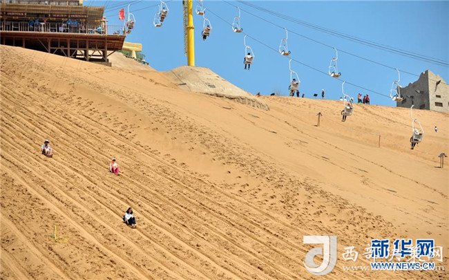 8月22日,游客在中衛(wèi)市沙坡頭旅游景區(qū)體驗滑沙。沙坡頭旅游景區(qū)因地制宜發(fā)展沙漠旅游,旺季日接待游客量達(dá)兩萬人次。新華社記者伍婧丹攝