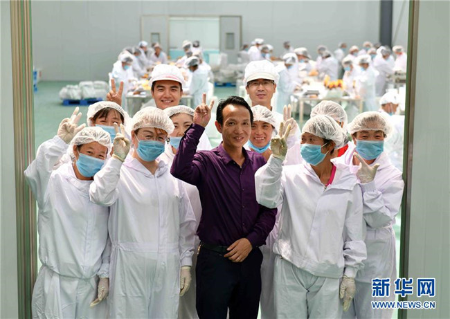 黃玉仁(前排中)在寧夏固原市隆德縣寧夏黃土地農(nóng)業(yè)食品有限公司與當(dāng)?shù)貑T工合影(8月29日攝)。來自福建莆田的黃玉仁2017年在隆德縣創(chuàng)辦寧夏黃土地農(nóng)業(yè)食品有限公司,利用當(dāng)?shù)伛R鈴薯種植優(yōu)勢(shì),制作馬鈴薯深加工產(chǎn)品,促進(jìn)當(dāng)?shù)伛R鈴薯銷售和農(nóng)民增收。目前公司已建成4條生產(chǎn)線,為當(dāng)?shù)?0多名百姓解決就業(yè)。 新華社記者郭緒雷攝