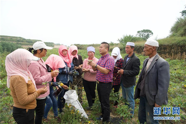 來自福建長(zhǎng)樂的林錦云(右四)在固原市河川鄉(xiāng)向農(nóng)戶講解采摘注意事項(xiàng)(8月28日攝)。2014年,林錦云通過土地流轉(zhuǎn)方式,承包了河川鄉(xiāng)1.5萬畝荒山,打造油用牡丹生產(chǎn)基地。目前,林錦云種下的7600畝油用牡丹已經(jīng)開始產(chǎn)生效益,公司已就近吸納村民300多人就業(yè),其中建檔立卡戶39戶,人均年收入2萬多元。 新華社記者姜克紅攝