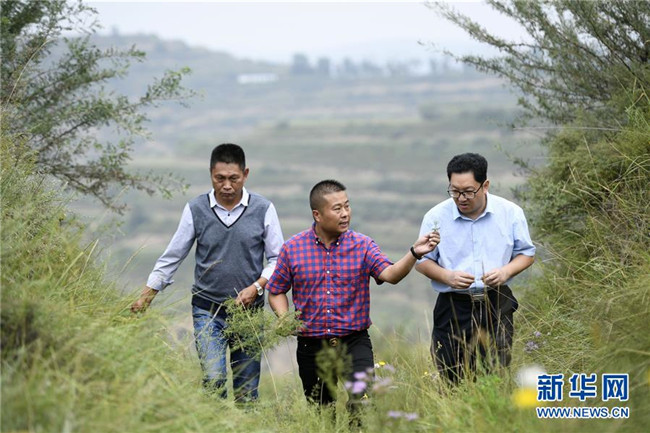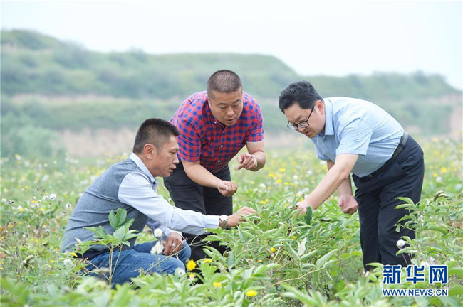 來自福建長(zhǎng)樂的林錦云(中)在寧夏固原市河川鄉(xiāng)與福建對(duì)口支援農(nóng)業(yè)專家(右)交流牡丹生長(zhǎng)情況(8月28日攝)。2014年,林錦云通過土地流轉(zhuǎn)方式,承包了河川鄉(xiāng)1.5萬畝荒山,打造油用牡丹生產(chǎn)基地。目前,林錦云種下的7600畝油用牡丹已經(jīng)開始產(chǎn)生效益,公司就近吸納村民300多人就業(yè),其中建檔立卡戶39戶,人均年收入2萬多元。 新華社記者王鵬攝