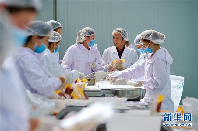 黃玉仁(右三)在寧夏固原市隆德縣寧夏黃土地農(nóng)業(yè)食品有限公司與員工交流馬鈴薯產(chǎn)品包裝注意事項(xiàng)(8月29日攝)。來自福建莆田的黃玉仁2017年在隆德縣創(chuàng)辦寧夏黃土地農(nóng)業(yè)食品有限公司,利用當(dāng)?shù)伛R鈴薯種植優(yōu)勢(shì),制作馬鈴薯深加工產(chǎn)品,促進(jìn)當(dāng)?shù)伛R鈴薯銷售和農(nóng)民增收。目前公司已建成4條生產(chǎn)線,為當(dāng)?shù)?0多名百姓解決就業(yè)。 新華社記者姜克紅攝