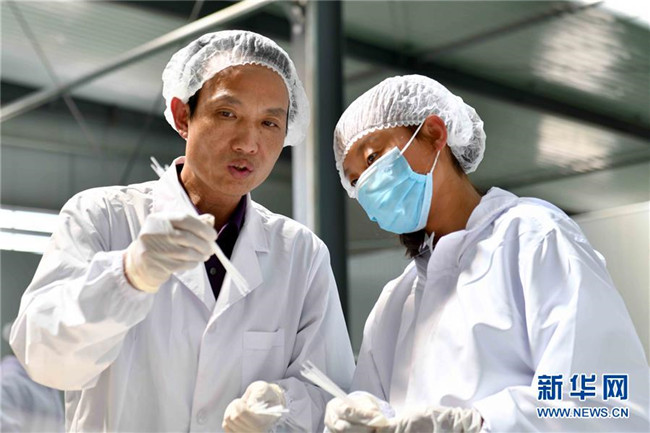 林玉清(左一)在寧夏固原市西吉縣寧夏澤艾堂生物科技有限公司與員工交流艾草產(chǎn)品研發(fā)方向(8月30日攝)。來自福建莆田的林玉清2017年3月在西吉縣成立寧夏澤艾堂生物科技有限公司,依托西吉縣優(yōu)質(zhì)的艾草種植條件,采用“公司+合作社+農(nóng)戶”的訂單農(nóng)業(yè)合作模式,與吉強(qiáng)、新營(yíng)等鄉(xiāng)鎮(zhèn)種植專業(yè)合作社合作建成艾草種植基地11個(gè)、推廣種植艾草6000畝,為當(dāng)?shù)厝罕娒撠氈赂讳伨托侣纷?。新華社記者姜克紅攝
