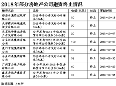 2018年10月份以來,已經(jīng)有多起涉房融資計(jì)劃中止/終止。上交所信息顯示,截至10月25日,已經(jīng)至少有8筆涉房融資計(jì)劃中止或終止審查。諸如,雅居樂擬發(fā)行的80億元非公開發(fā)行公司債券“終止”,該筆公司債曾于今年7月“中止”發(fā)行。合生創(chuàng)展100億規(guī)模的租賃住宅專項(xiàng)公司債券、天津薊州新城建設(shè)投資有限公司30億元的非公開發(fā)行公司債券、北京鴻坤偉業(yè)房地產(chǎn)開發(fā)有限公司20億元的住房租賃專項(xiàng)公司債券“終止”審查。10月份顯示“中止”融資計(jì)劃的有:中山招商-時(shí)代地產(chǎn)購房尾款資產(chǎn)支持專項(xiàng)計(jì)劃,擬發(fā)行金額14.3億元;奧園集團(tuán)有限公司非公開發(fā)行2018年住房租賃專項(xiàng)公司債,擬發(fā)行金額10億元,等等。