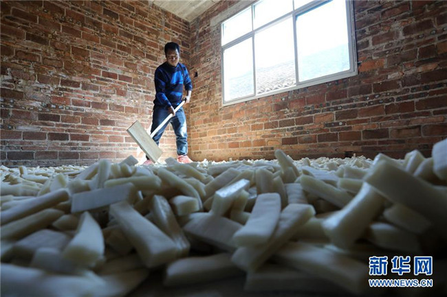 11月4日,在貴州省黎平縣中潮鎮(zhèn)佳所侗寨,村民在晾曬“侗果”粑塊。 近日,貴州省黔東南苗族侗族自治州黎平縣中潮鎮(zhèn)佳所侗寨的村民們搶抓晴好天氣,忙著制作、晾曬“侗果”,侗寨里一派忙碌。“侗果”是當(dāng)?shù)囟弊逋捅貍涞奶厣朗?,是將蒸熟的糯米切成小粑塊后,再經(jīng)曬干、油炸、澆紅糖和上芝麻等工序制作而成。 新華社發(fā)(楊代富 攝)