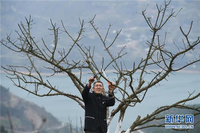 重慶市巫山縣曲尺鄉(xiāng)朝陽(yáng)村村民在脆李種植地里對(duì)脆李樹(shù)進(jìn)行管護(hù)(2019年2月16日攝)。新華社記者王全超攝