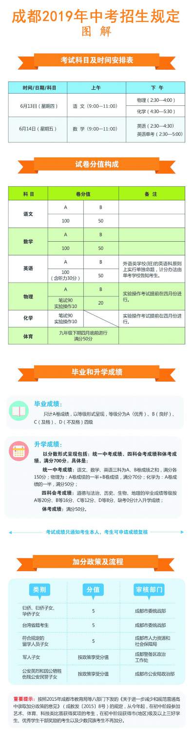 今年中考考試時(shí)間與往年一樣,為6月13日、14日,考試科目和計(jì)分辦法均未作調(diào)整。也即是說,今年中考統(tǒng)一考試科目依然為語文、數(shù)學(xué)、英語、物理、化學(xué)、體育六科。其中,物理、化學(xué)包括實(shí)驗(yàn)操作考試。體育考試以及物理、化學(xué)實(shí)驗(yàn)操作考試在九年級(jí)下期4月底以前,由各區(qū)(市)縣組織進(jìn)行。九年級(jí)結(jié)束時(shí),語、數(shù)、英、物、化五科的畢業(yè)考試與升學(xué)考試一并進(jìn)行,各科筆試考試均為閉卷考試,具體時(shí)間安排詳見圖解。其中,外語類學(xué)校(班),如成外實(shí)外等校的英語科,原則上單獨(dú)命題,統(tǒng)一考試。