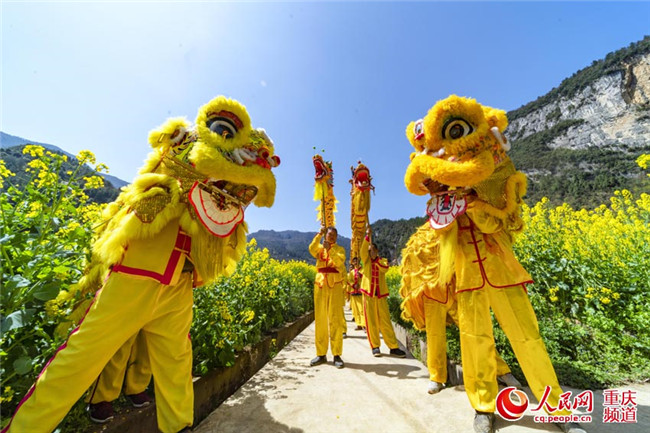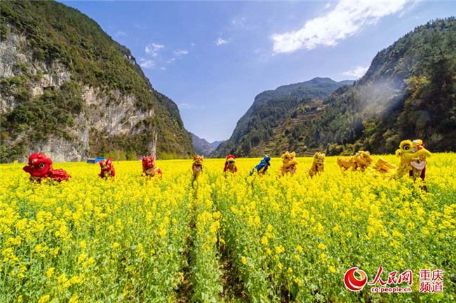 25日,重慶豐都縣暨龍鎮(zhèn)烏羊壩1000畝油菜花盛開,非遺表演“高桿舞獅”為游客助興。(王嫚 林登周)